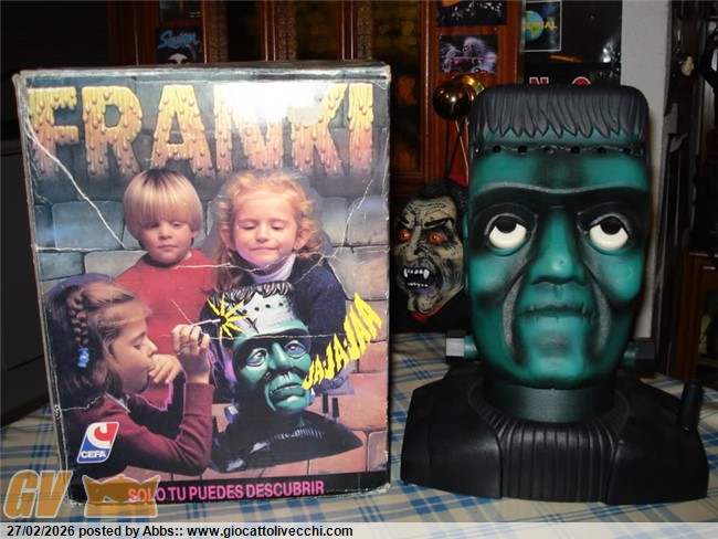 un gioco "interattivo" con una percentuale di divertimento pari a zero! il gioco era edito dalla spagnola Cefa, e rilasciato nell`ormai lontano 1987. ma come funzionava sta roba? semplicissimo: sulla fronte della creatura c`erano dei fori, e il gioco consisteva nell`infilarci dentro un sensore sperando di non beccare il buco che faceva saltare in aria la calotta cranica del mostro tra urla e lamenti vari preregistrati. ovviamente ad ogni nuova partita il meccanismo interno selezionava automaticamente sempre un buco diverso. divertentissimo!: " tocca a me! oh, l`ho scampata! ora tocca a te " " vado? che paura! aha! l`ho scampata anche io! ora tocca di nuovo a te " " vado?....... noooo!!! " UAAAAAAAA!!!! GRRRRRRRR!!!! ulrla il mostro con la calotta cranica scoperchiata. fine del gioco. stupendo!!! una longevità paragonabile ad un panino con la Nutella dopo tre mesi di dieta ferrea. chissà se Mary Shelley si sarebbe mai immaginata che 169 anni dopo, il suo dottor Fankenstein avrebbe dato vita a Franki! un gioco in scatola indegno. e loro all`epoca si divertivano a raccontarsi storie di fantasmi. me li immagino invece con Franki! a casa di Lord Byron! magari gli sarebbe piaciuto. me la vedo Mary Shelley che infila un sensore nella fronte della sua creatura, poi magari gli fa saltare la calotta cranica, e dice: " ello è tosto ito pel cielo ". però il gioco bisogna dire che è scenico, bisogna rendergli giustizia, e la testa di Franki è veramente super grottesca e scolpita con gusto. bellissimo per esempio per arredare una stanza a tema mostro, o per completare una collezione tutta mostruosa. era proprio " una testona di Frankenstein ", sembra quasi uscito da un luna park. era un bel giocattolo in questo senso. in tema poi anche i sensori da infilargli nel cranio che richiamano agli elettrodi del classico Frankenstein filmico.