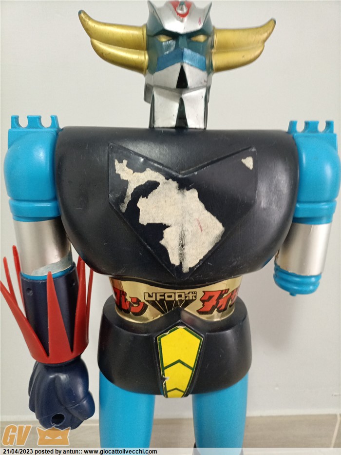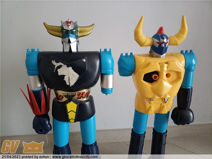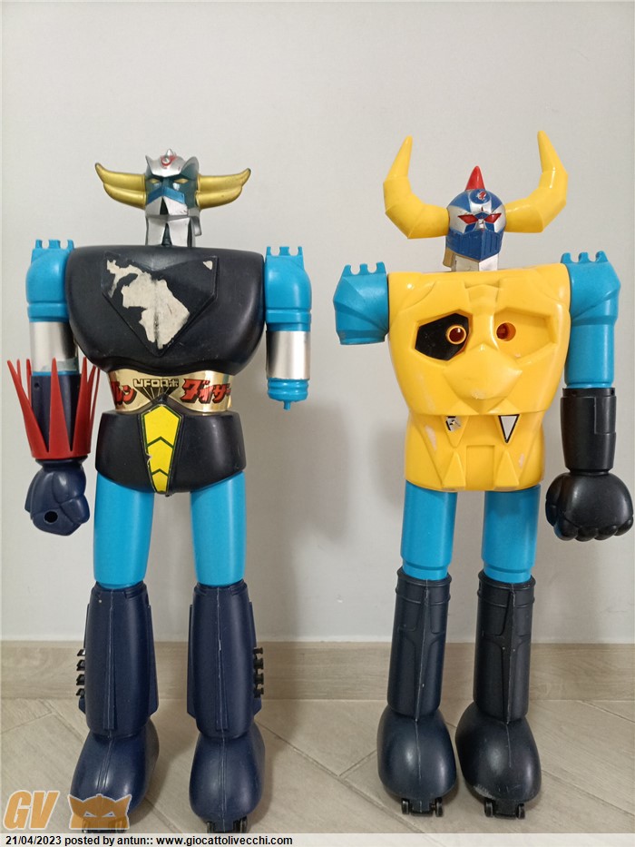 Goldrake e Gaiking jumbo della Mattel alti 60cm, il Goldrake ha tutte le giunture rigide incluso movimento della testa, uno dei due portamissili alle gambe è un ottima riproduzione in resina per il resto tutto originale senza rotture/ammaccature. Il gaiking è un po` mal ridotto ma senza ammaccature. Come si evince dalle foto ha una crepa sul retro, il meccanismo spara missili è mancante, sotto spalla sx manca il perno per aggancio spara pugno aggancio gamba sx in parte rotto vedi foto, ma una volta agganciato si tiene bene in piedi i pugni di entrambi i robot sono originali. Comprate esattamente quello che vedete in foto.