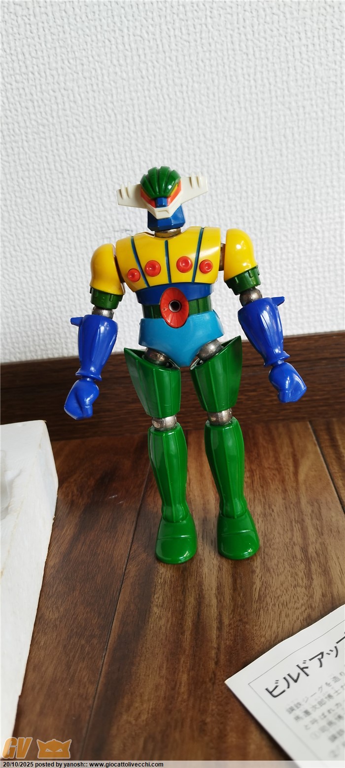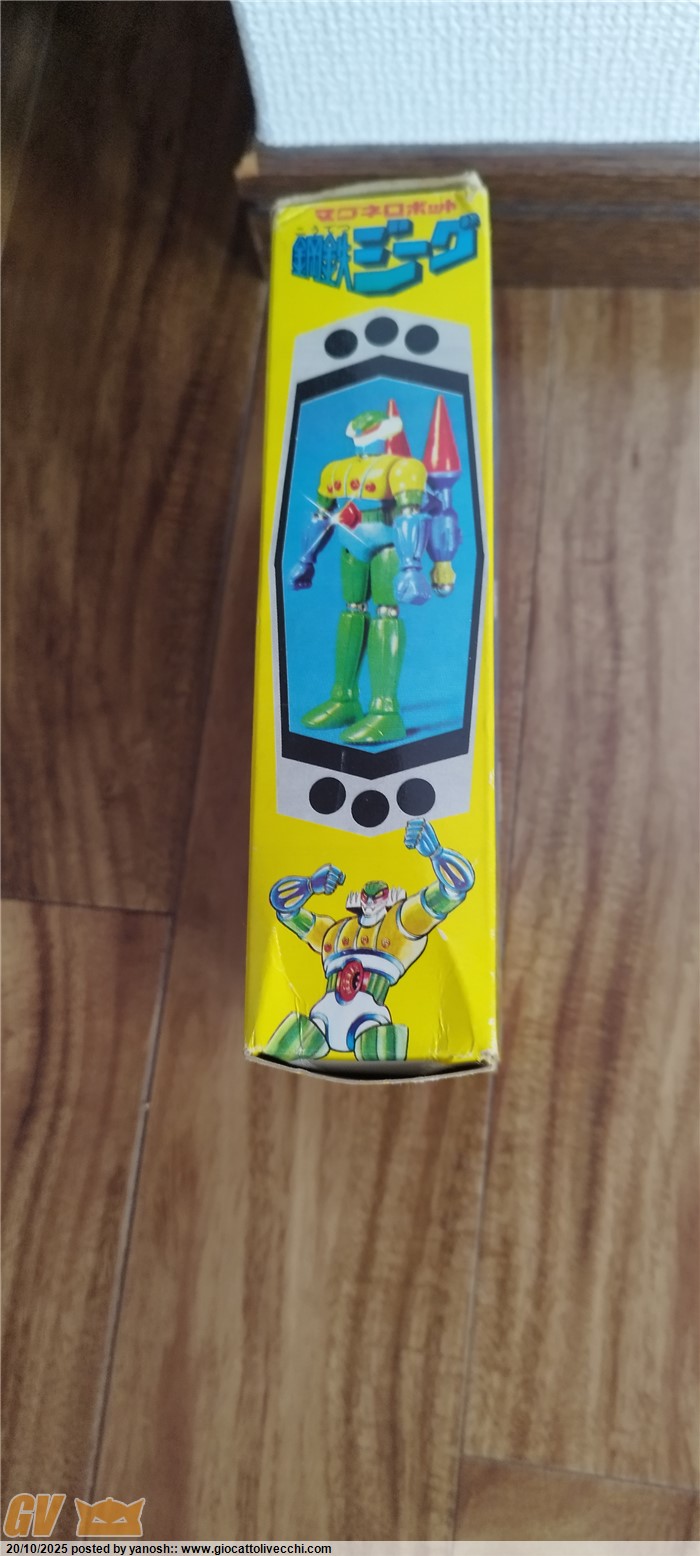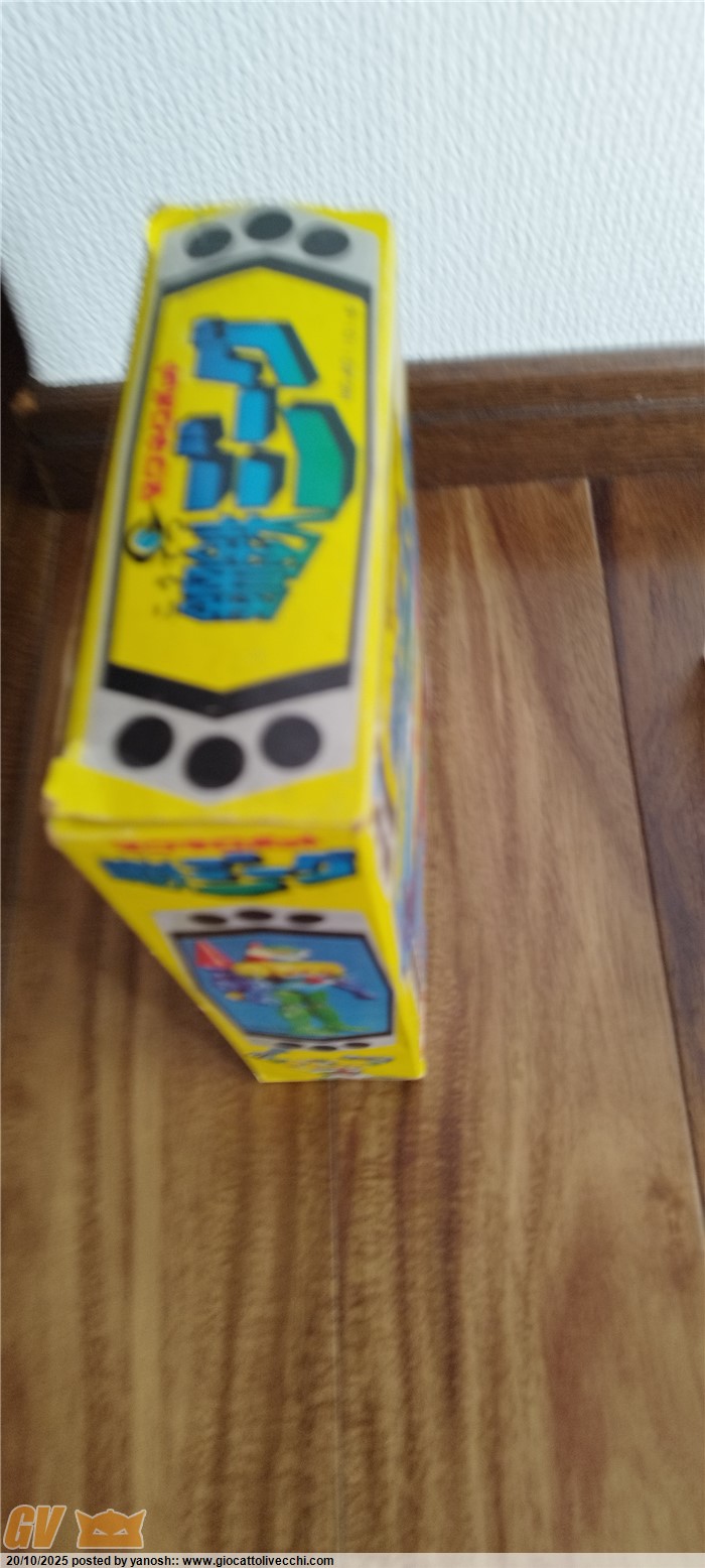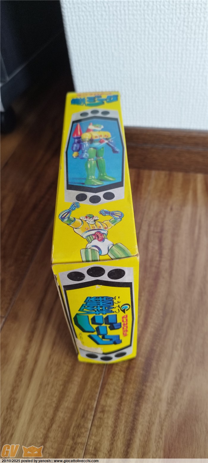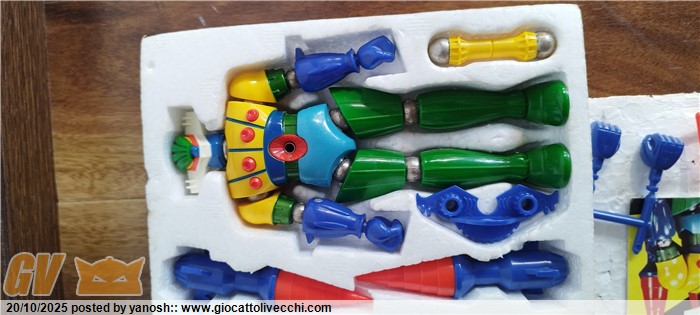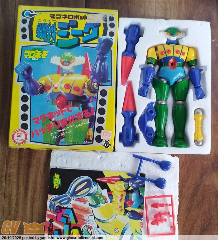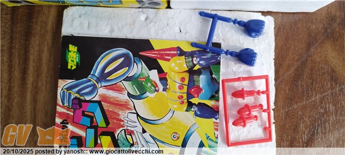 Robot Completo, bello , rigido. Un missile e due pugni sui telai. Polistirolo bello integro, catalogo bello, scatola al di sopra della media, abbastanza rigida. Coperchio presente. Molto raro in queste condizioni.