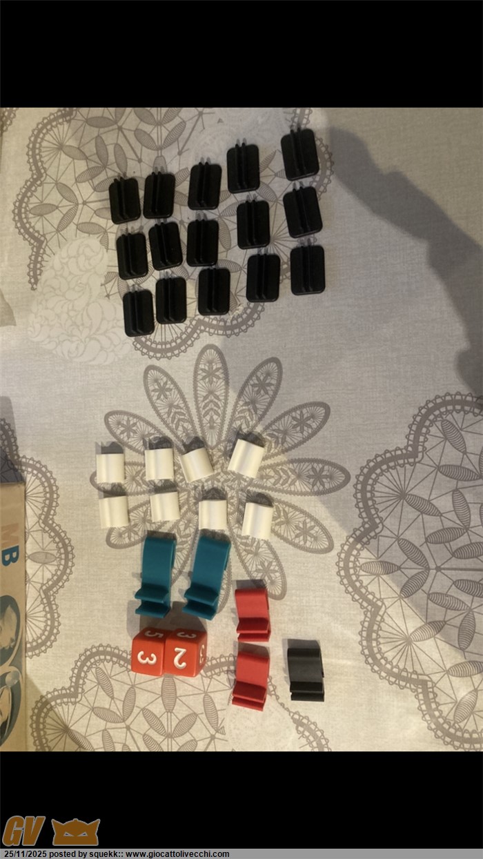 Ci sono tutti i componenti per giocare , (c’è addirittura un elastico di riserva per la trappola del lampadario)manca solo un fermaglino nero