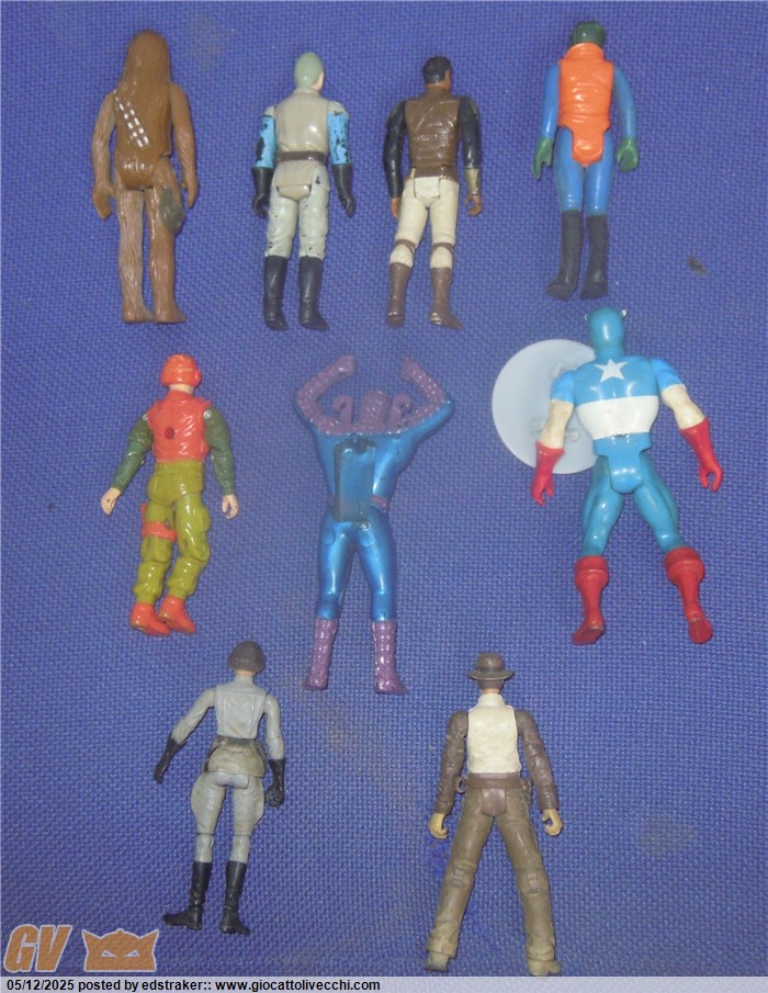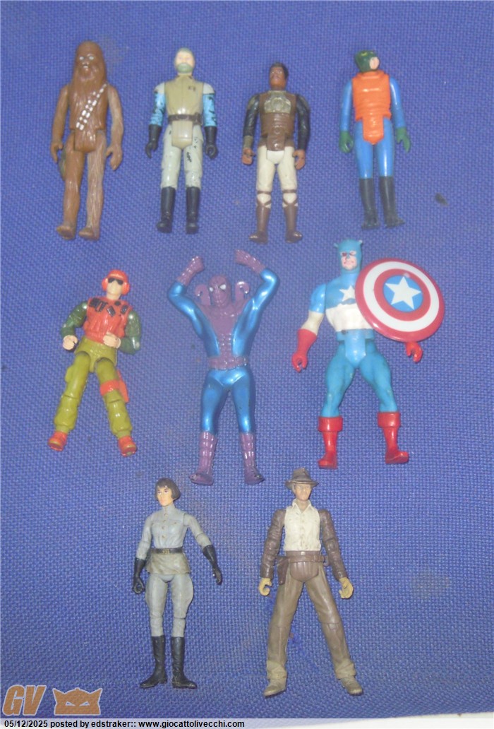 Tutti senza armi e accessori ma integri. Ci sono dei personaggi di Star wars delle serie del 1977 e del 1982, un Gi Joe Skidmark, uno Spiderman paracadutista, un Capitan America Secret Wars (lo scudo non è il suo ma di un action figure + recente) e Indiana Jones e la sua antagonista el film Indiana Jones e il teschio di cristallo. Tutti come in foto.