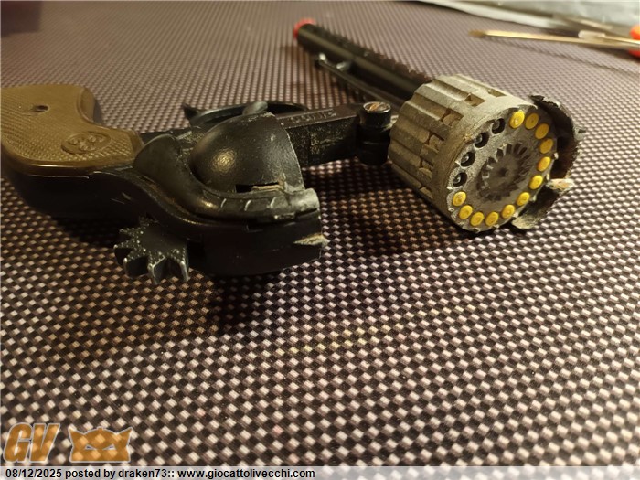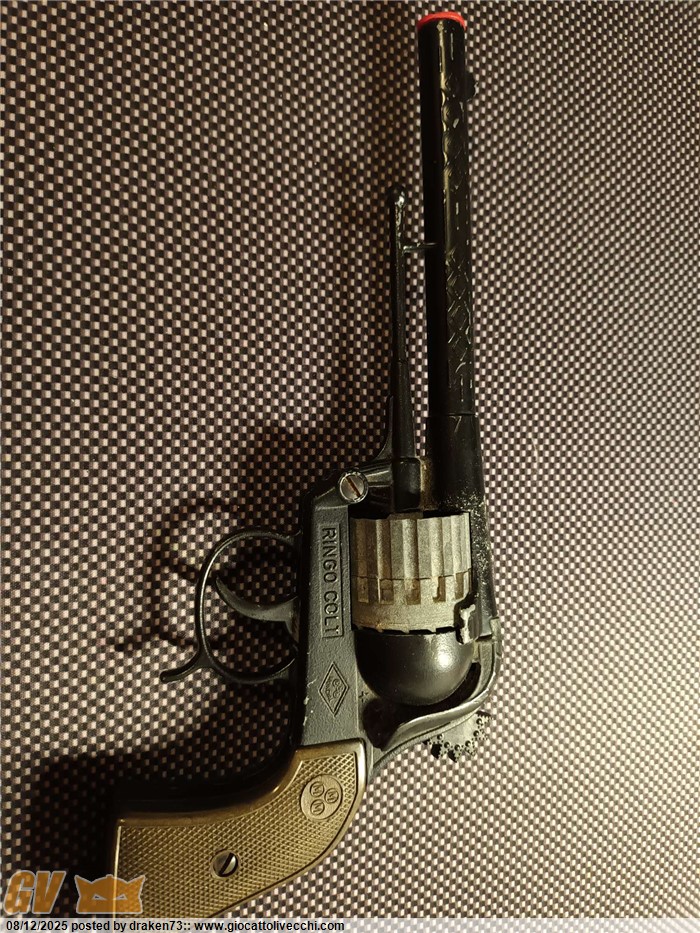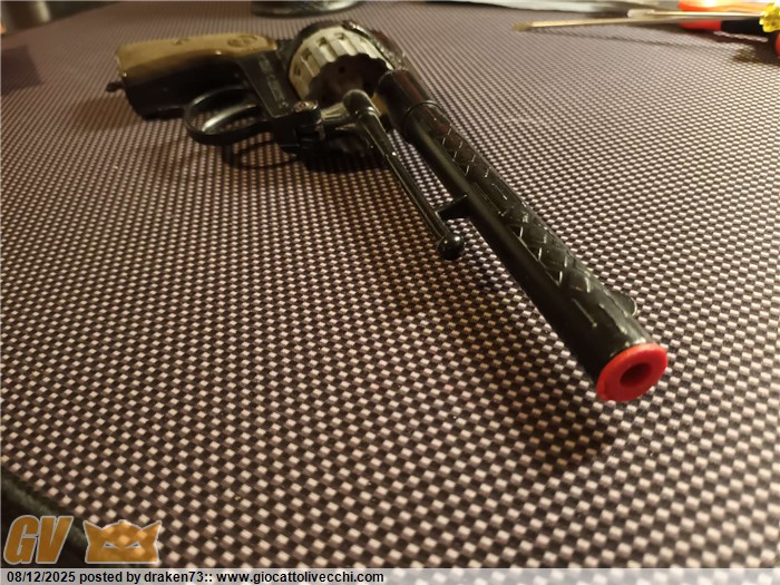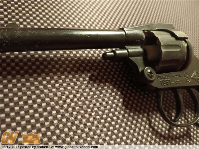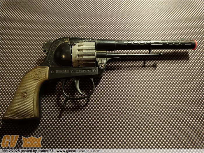 Revolver giocattolo in buone condizioni, tamburo da 16 colpi, pistola molto pesante e integra, peccato che il meccanismo cane tamburo non funzioni bene- trattasi di giocattolo fine anni 70 quindi con + di 50 anni di età, bella da esporre, direttamente dalla mia collezione.