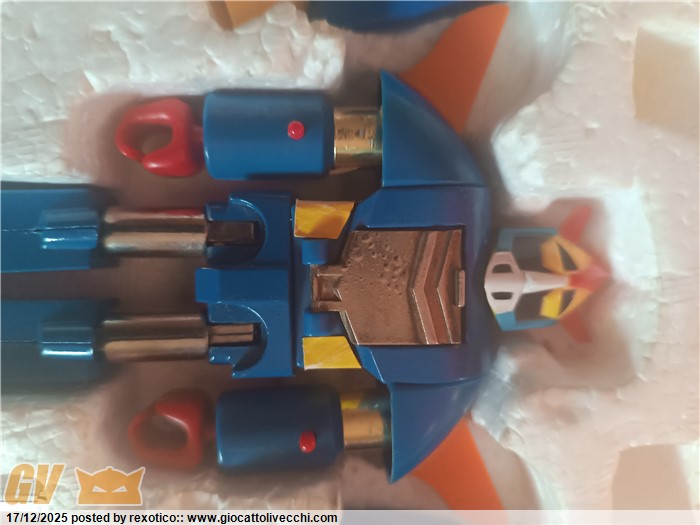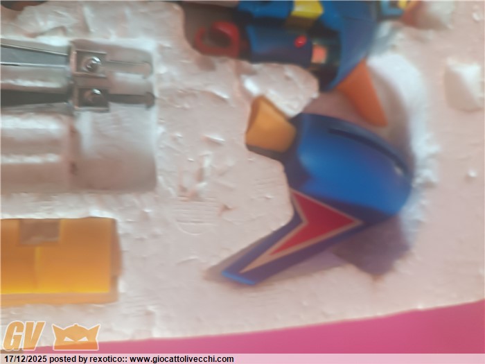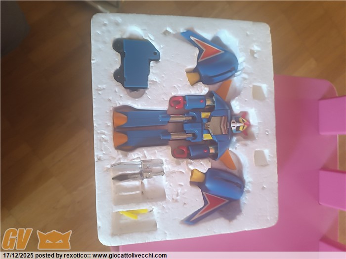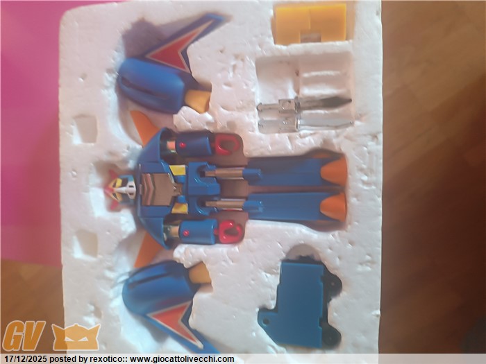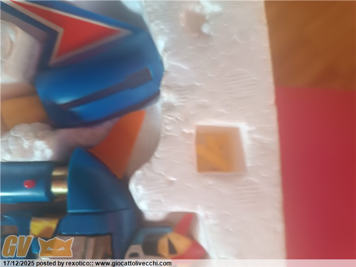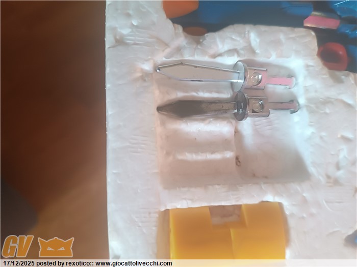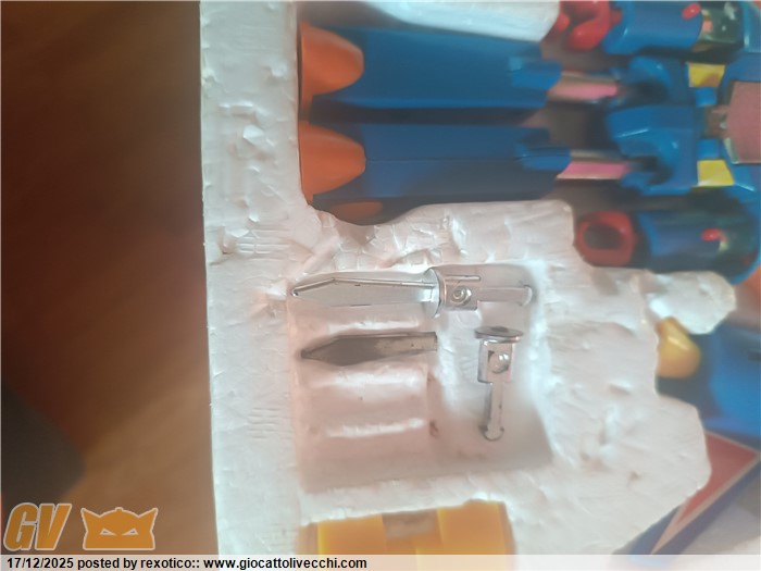 Manca qualche accessorio, ma poca cosa: 2 pugni di riserva ( posso procurarli a 25/30 euro da un conoscente)., 1 missilino giallo e 2 spadine argentate ( ne ho 2 su 4). Una delle spadine mentre la provavo si è spezzata.