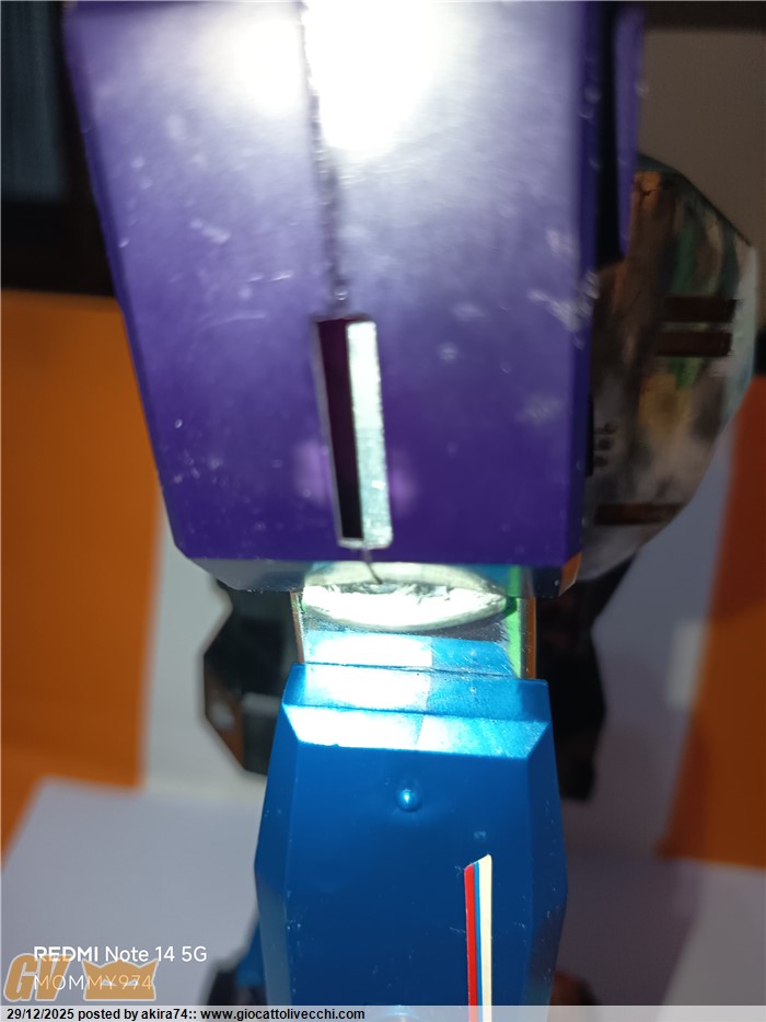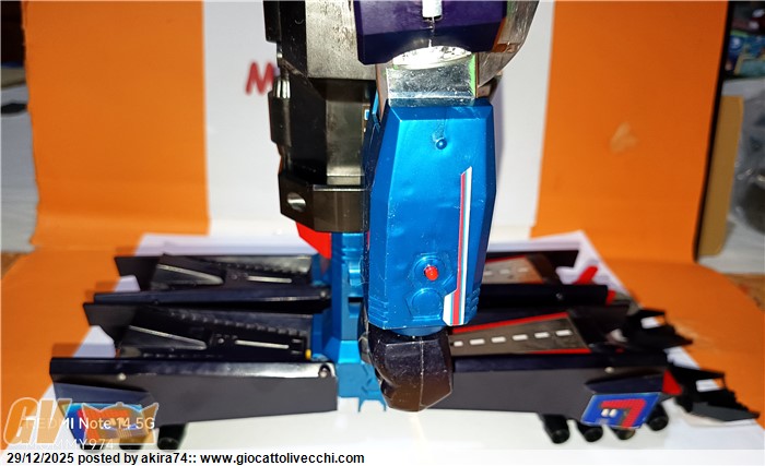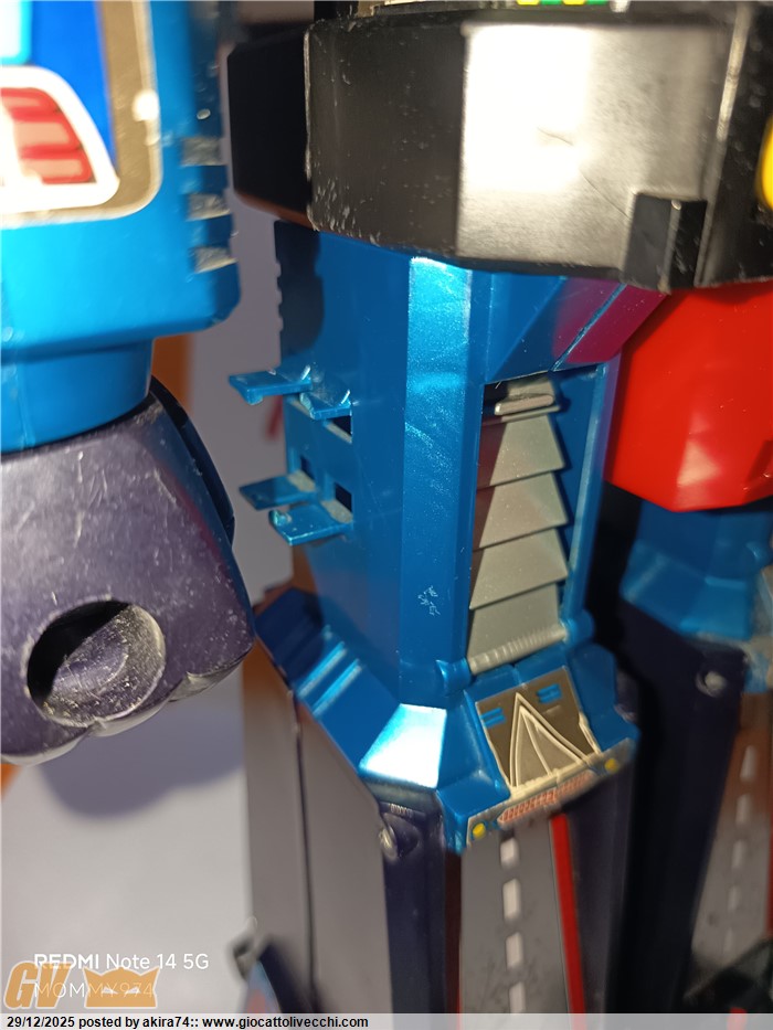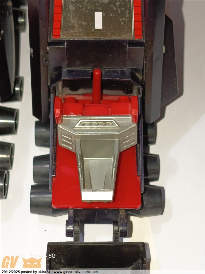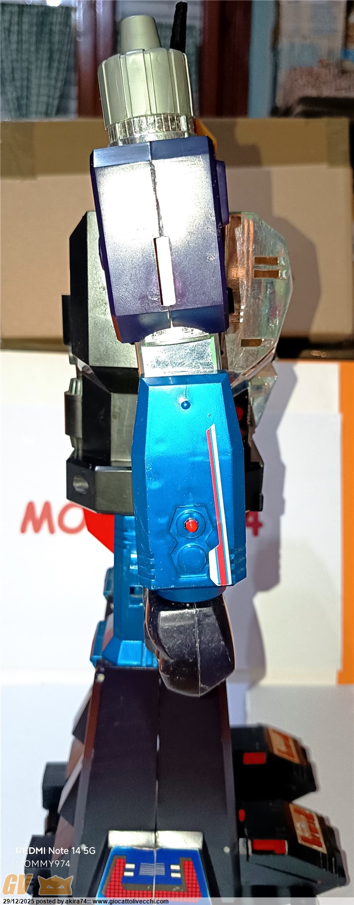 Diaclone Il Grande, come visibile in foto, è in ottime condizioni. Sono presenti gli accessori mostrati, inclusi 2 dianauti monocolore. I supporti per i missili sono in buono stato. Il segnale del braccio destro risulta un po’ debole, ma non è stato forzato. Il blocco del braccio destro è assente, tuttavia il braccio resta in posizione. Si consiglia di chiedere sempre prima di acquistare