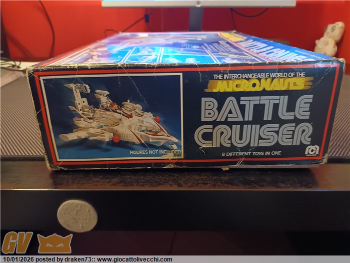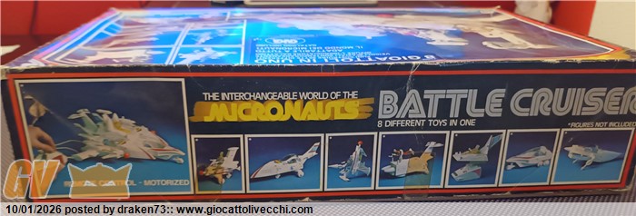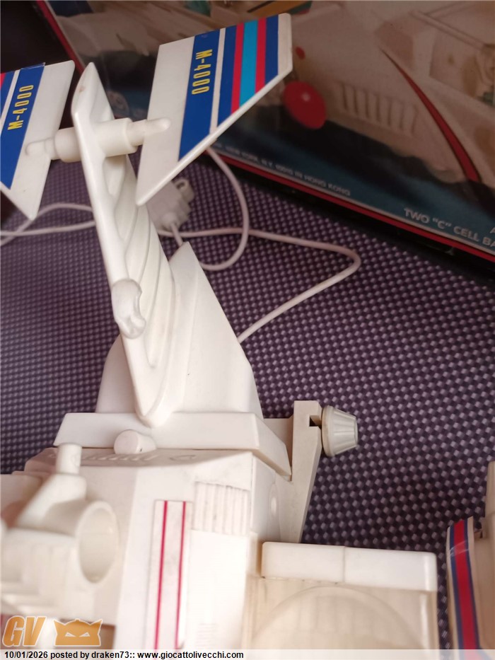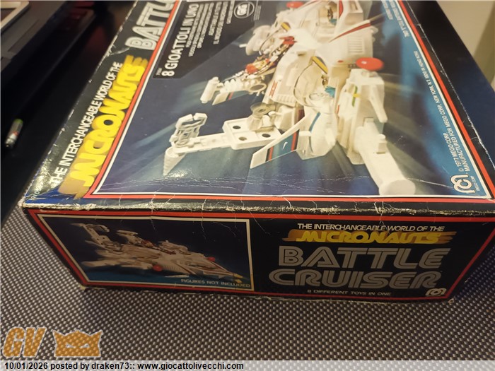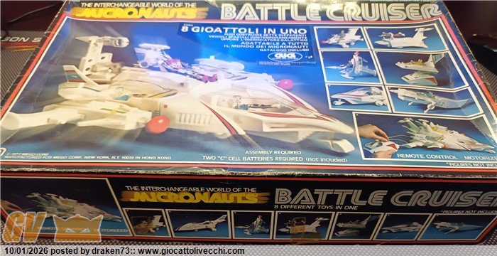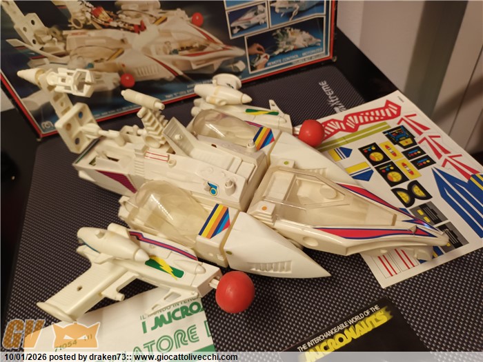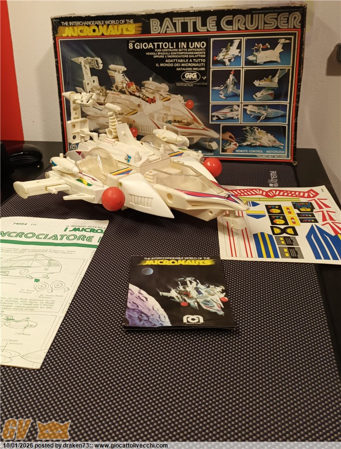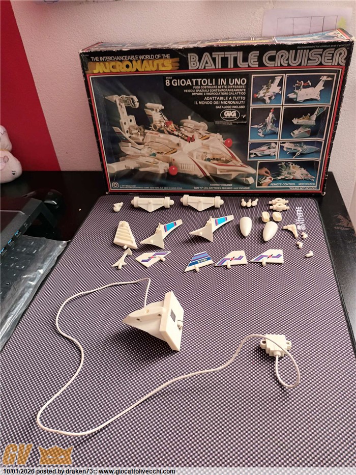 Incrociatore micronauti, completo di tutti gli accessori, dispositivi di sparo funzionanti, segnalo leggero ingiallimento della plastiche, e una anomalia sull`alettone posteriore vedi foto, alcune decalcomanie rialzate a corredo istruzioni, catalogo e il foglio adesivi ancora da attaccare.