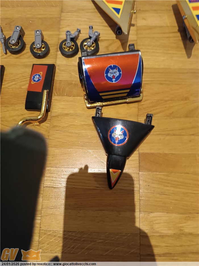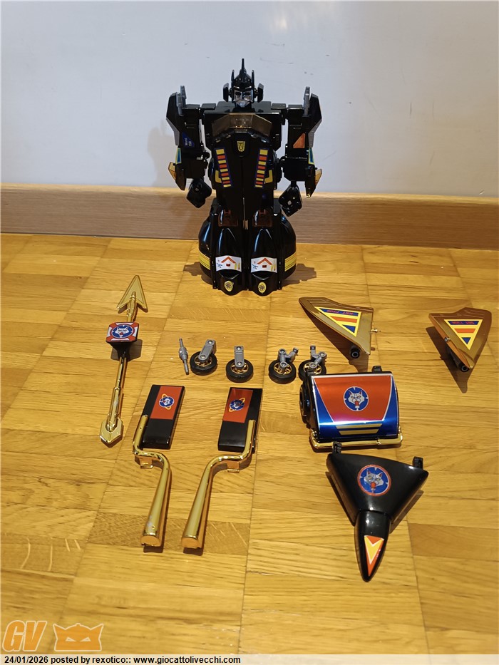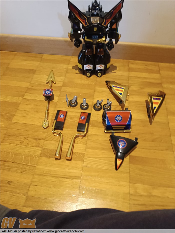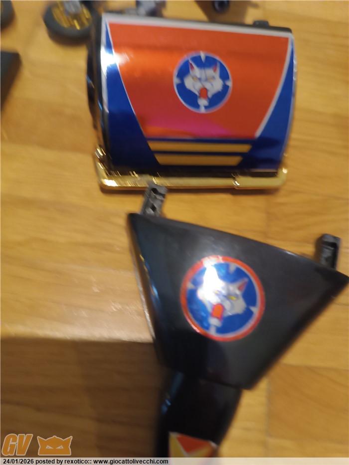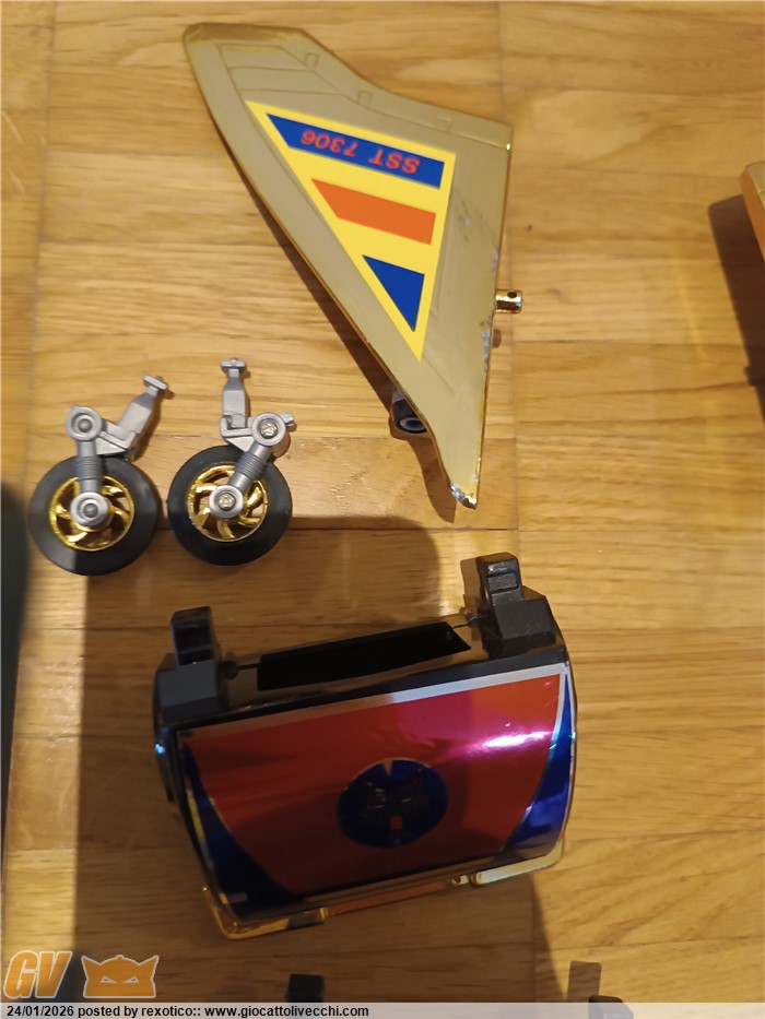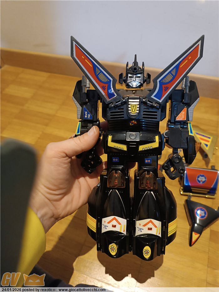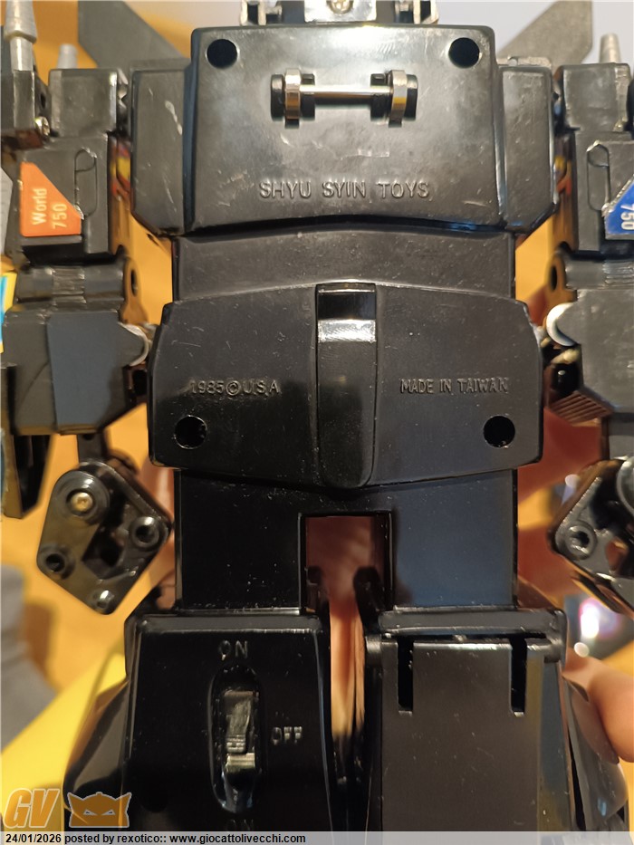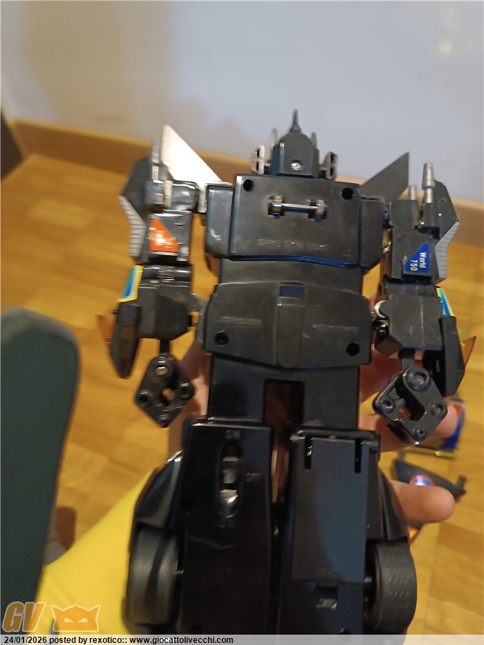 Versione dx trasformabile, motorizzato, funzionante con 2 batterie stilo. Bootleg anni 80 in ottime condizioni, misure come il dx ufficiale. Solo un pernobdi ala dorata rotto.