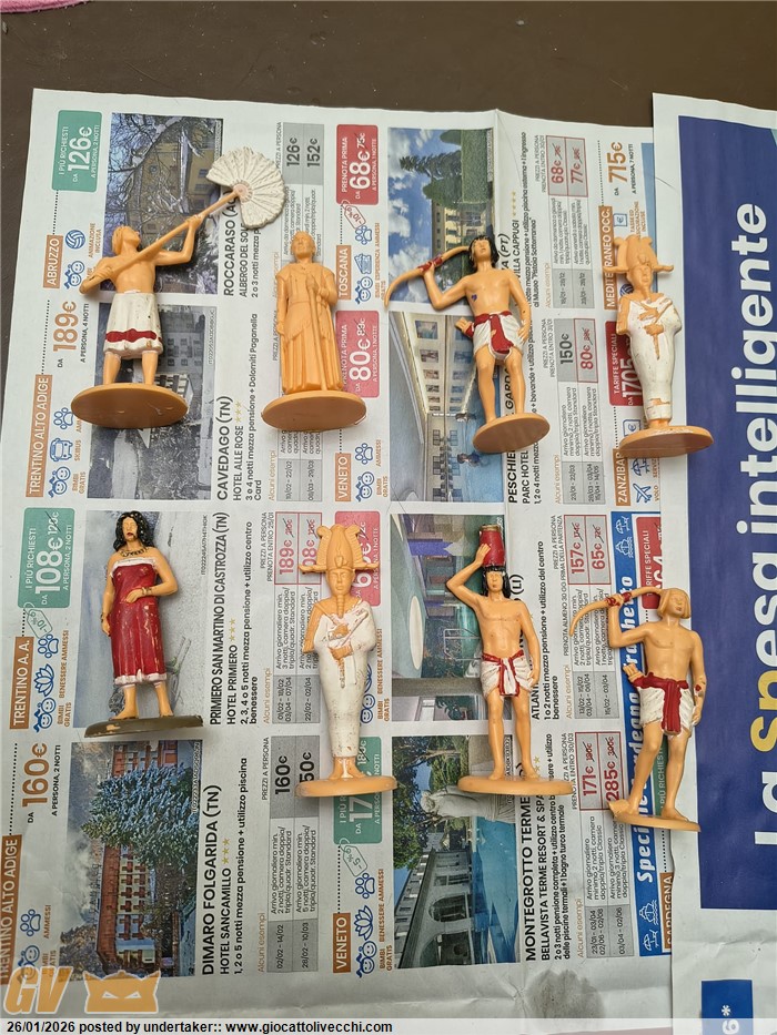 lotto composto da 18 personaggi misti , 2 bighe di cui una incomopleta e 2 sarcofagi che non sono riuscito a aprire, tutto senza rotture e in buone condizioni.