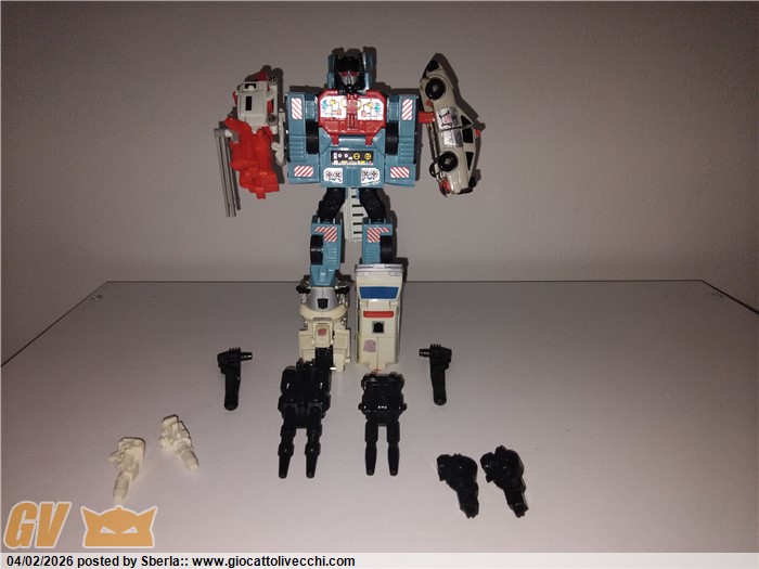 presenti i 5 trasformes in buono stato con accessori, vedere foto. la scatola è rovinata ma presente. polistirolo buono. Computron presenti i 5 transformers, e piede di Predaking