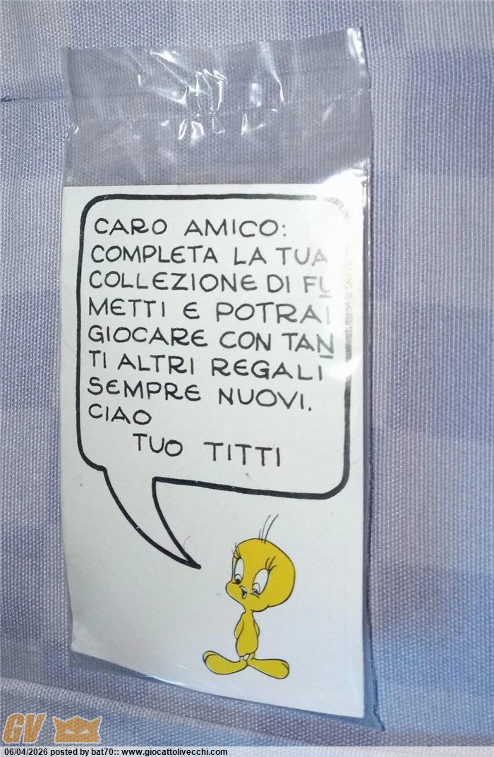 IMPORTANTE: giocattolivecchi.com non è responsabile per il contenuto dei messaggi presenti nei forum e degli annunci presenti sul mercatino. I messaggi dei forum rappresentano l'espressione del pensiero degli autori ed il mercatino è uno spazio offerto ai privati che possono vendere il loro vecchi giocattoli.