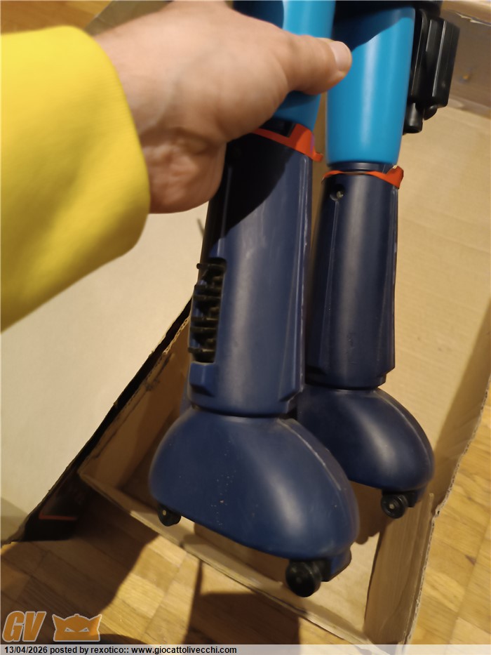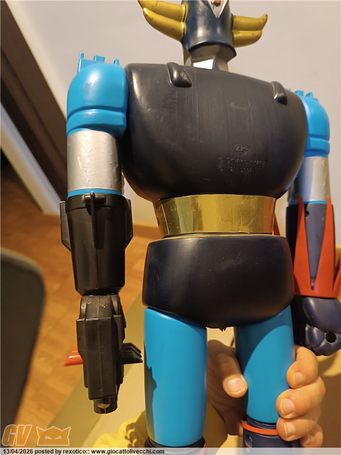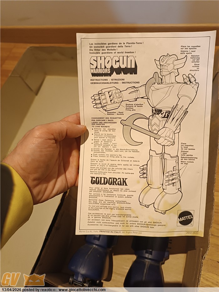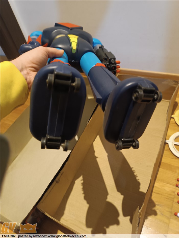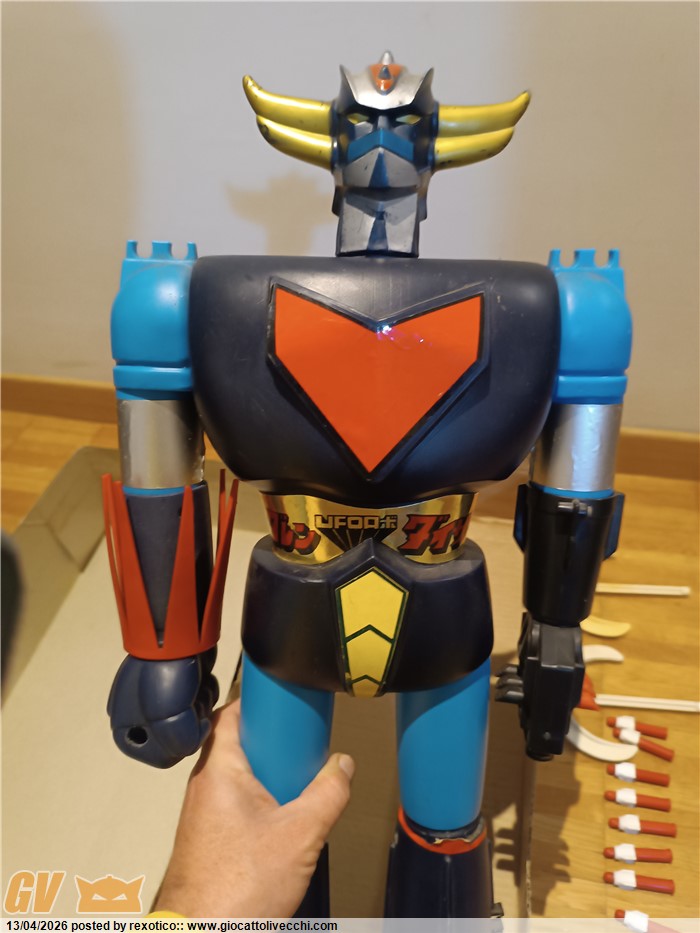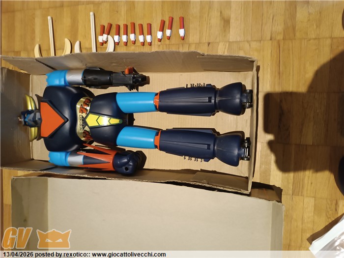Jumbo molto bello, tutto originale: robot, 10 missili, 2 alabarde, istruzioni, scatola! Una delle due alabarde un po` ingiallita, come spesso capita. Scatola con qualche riparazione. Difficile da trovare così.