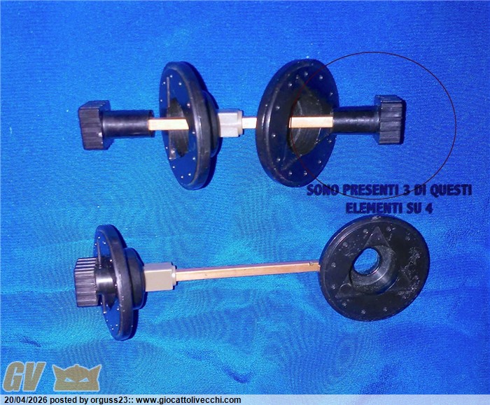 GLI ASSI CON LE RUOTE ERANO SMONTATE, UNO DEI TRE ELEMENTI QUADRATI DOVE SI FISSANO LE RUOTE E` MANCANTE, VEDI FOTO CERCHIATA.