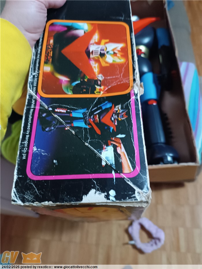 Scatola consumata e con riparazioni, ma robot molto bello, con colori vividi. Tutto originale inclusi 14 missili e 2 spade! Versione Japan con brain condor fisso. Unico difetto la la mancanza di un dentino reggi missile su una gamba.